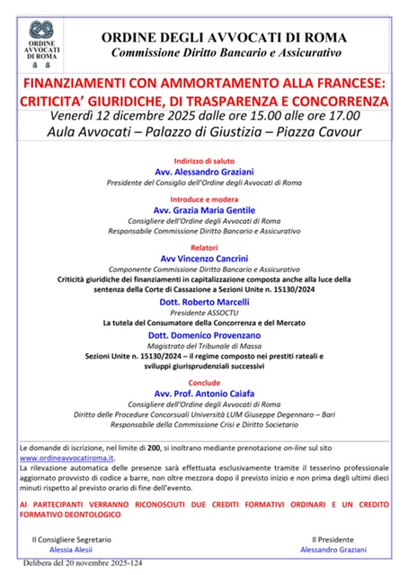 Segnaliamo questo incontro previsto per venerdì 12 dicembre (in presenza ore 15-17, Aula Avvocati, Palazzo di Giustizia piazza Cavour), ordanizzato dall'ODA di Roma, Commissione Diritto Bancario e Assicurativo